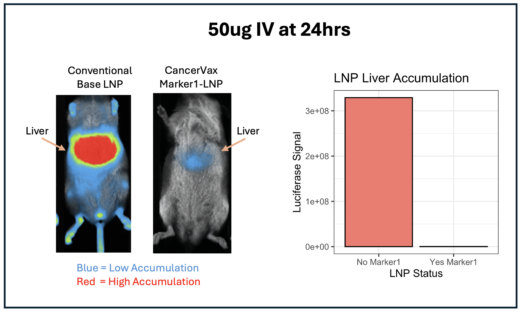 Most conventional LNPs get trapped in the liver and cause liver toxicity. This is a major reason why many LNP therapies fail in clinical trials. In this study, a large proportion of CancerVax LNPs did not appear to accumulate in the liver compared to the base conventional LNP formulation. This may indicate systemic circulation and distribution to organs and tissues where cancer might occur.
