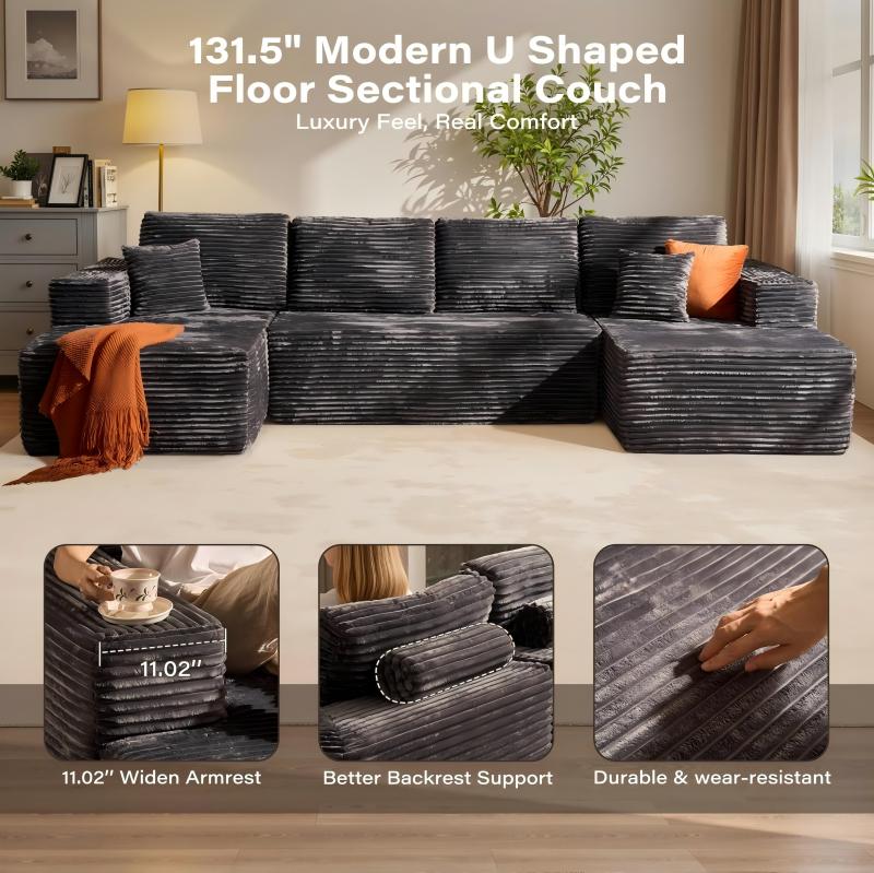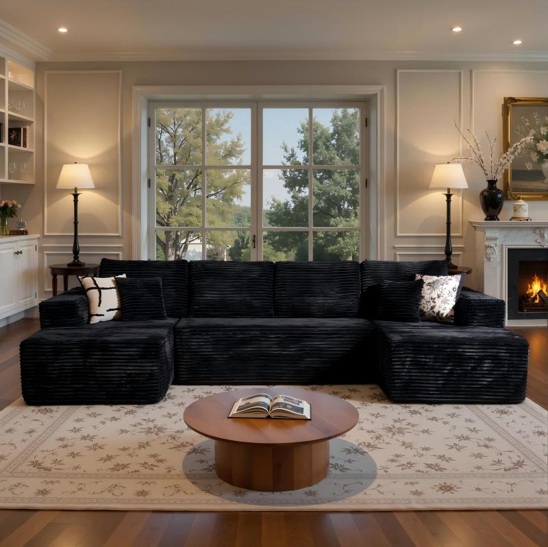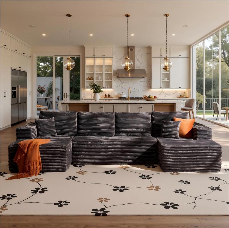 Visually, it defines modern coziness. Wrapped in plush, soft-touch corduroy, the sofa brings an instant sense of calm and texture to any living space. Its clean U-shaped silhouette anchors the room with understated elegance, while neutral tones like black, beige, and gray complement both contemporary and classic interiors. Whether you’re styling a new home or refreshing your space for the holidays, it’s a centerpiece that feels both refined and lived-in — a perfect reflection of modern family life.